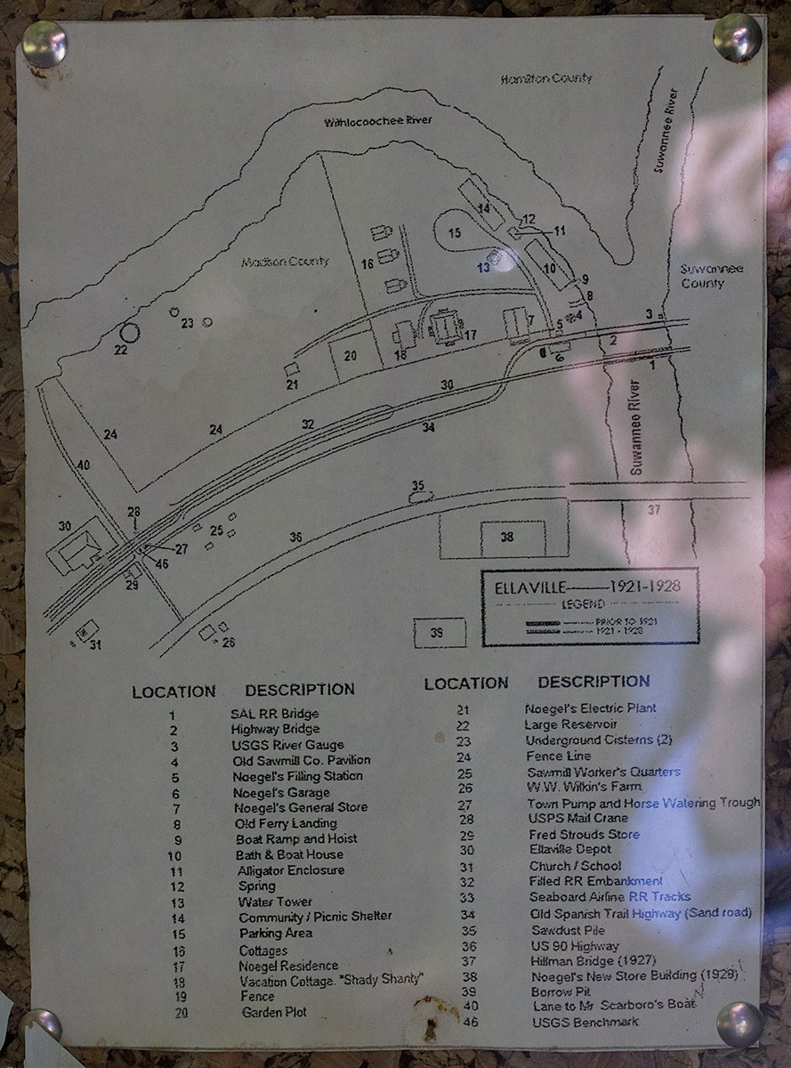 There is a map of Ellaville from the time of the new paved highway and Noegel’s store at the kiosk where the Drew Mansion Ruins Trail and the Florida Trail intersect.