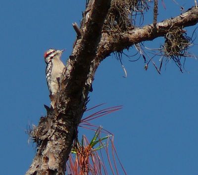 Downy woodpecker, the smallest woodpecker in North America, and very energetic. It was hopping around one of the pine trees affected by the controlled burns.