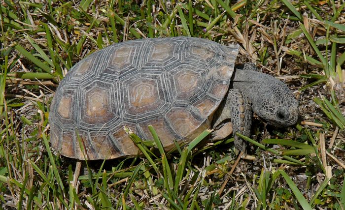 Gopher tortoise. This little guy (or girl? Aren’t you supposed to be able to tell by length of tail? I see no tail in any of my pictures, though I wasn’t trying to shoot for that at the time) was on the side of the road near the ferry dock. The grass it’s in is what passes for lawn here. We saw another, much larger gopher tortoise on the island, but I didn’t get any good pictures of it.